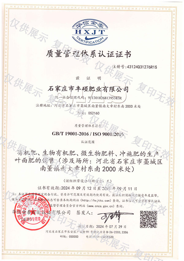 石家莊市豐碩肥業(yè)有限公司是一家集新型肥料的研發(fā)、制造、營銷、服務(wù)于一體的高新技術(shù)企業(yè),公司自2008年創(chuàng)辦以來,一直致力于新型肥料的技術(shù)研發(fā)和市場(chǎng)推廣。公司組建了豐碩新型肥料研究中心(院士專家企業(yè)工作站),自主知識(shí)產(chǎn)權(quán)研發(fā)團(tuán)隊(duì)專業(yè)科研人員20余人,獲得了多項(xiàng)肥料國家發(fā)明專利。公司目前已擁有發(fā)酵類有機(jī)肥、微生物菌劑、生物有機(jī)肥、土壤調(diào)理劑、大量元素水溶肥、含腐植酸肥料、含氨基酸肥料、中微量元素肥料等8大品類,“金維克”、“豐碩沃農(nóng)”等2大自有品牌,擁有20多個(gè)暢銷品種。目前,我公司已經(jīng)通過了“ISO9001 質(zhì)量管理體系認(rèn)證”、“ISO14001 環(huán)境管理體系認(rèn)證”、“OHSAS18001 職業(yè)健康管理體系認(rèn)證”。...